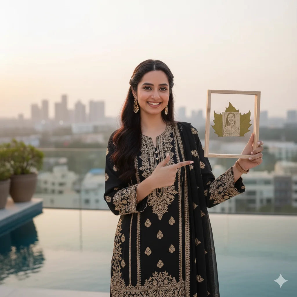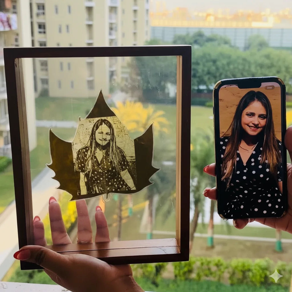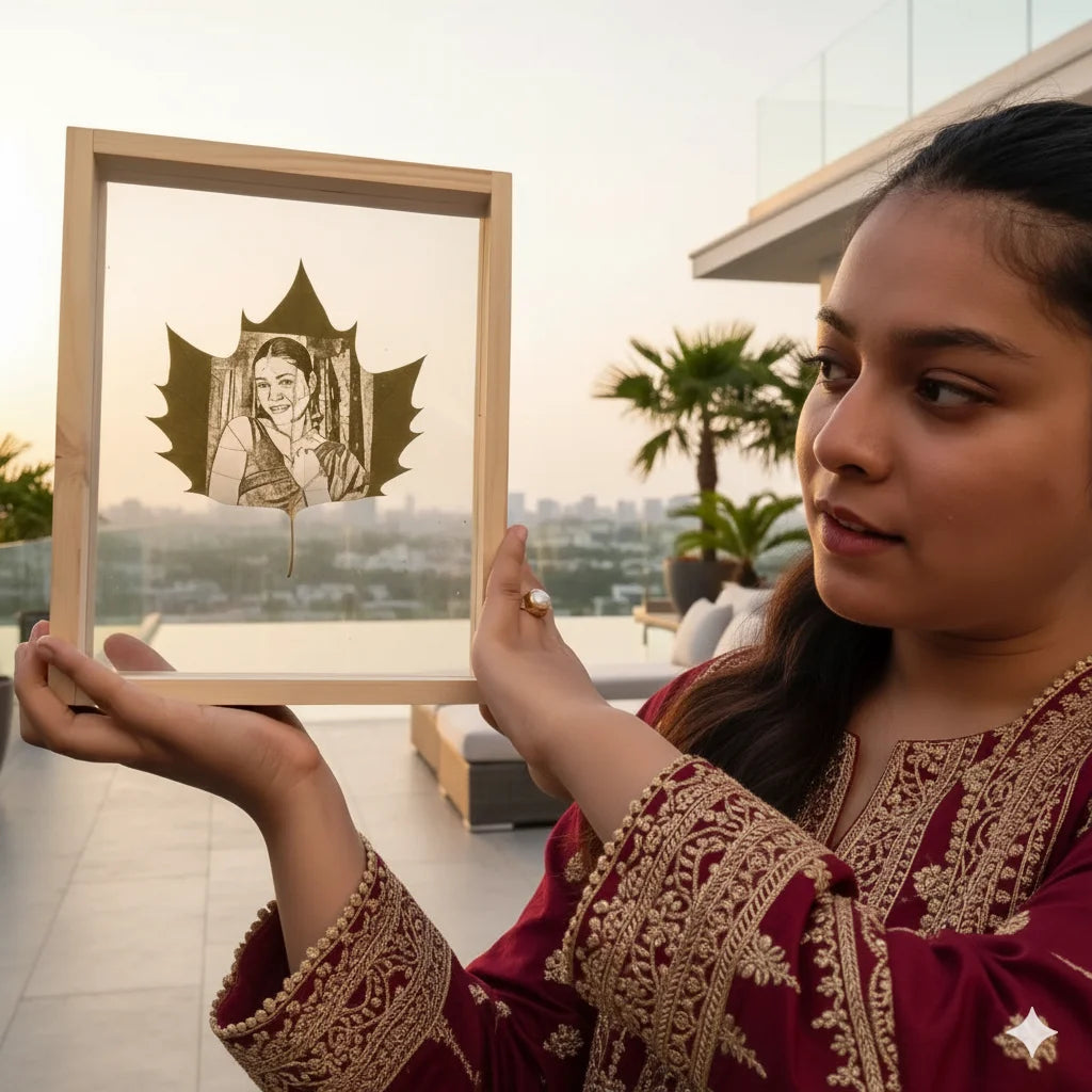 Your leaf will be elegantly framed in genuine handcrafted wood, with two acrylic sheets for a refined finish. Delivered to your doorstep in a beautifully branded gift box, it’s the perfect touch of elegance.